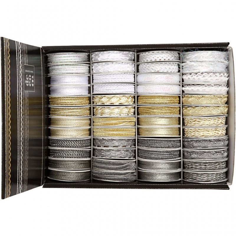 Dekorationsbånd, B: 5-10 mm, Hvid,guld,sølv, 2 M, 48 Rl.