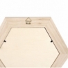 Sekskantet spejl i ramme af lyst træ. Bagsiden er monteret med beslag til ophængning
