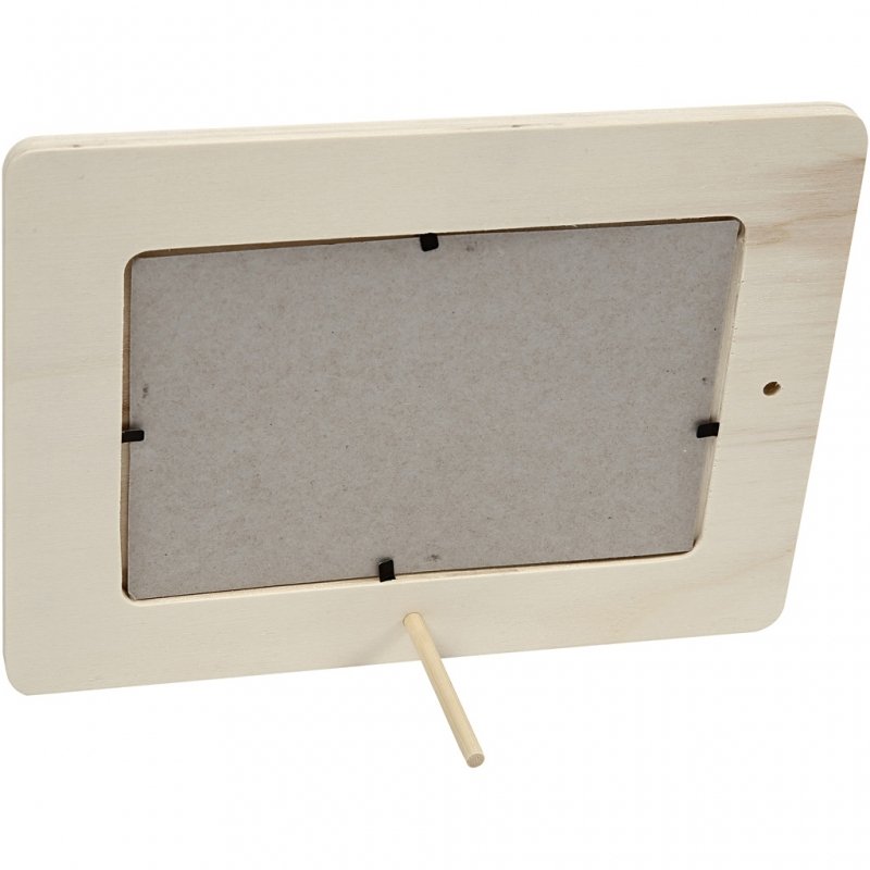 Firkantet ramme af lyst træ med afrundede hjørner, der kan hænge eller stå (vandret eller lodret). Bagsiden er med beslag og huller, støttepinde til montering medfølger