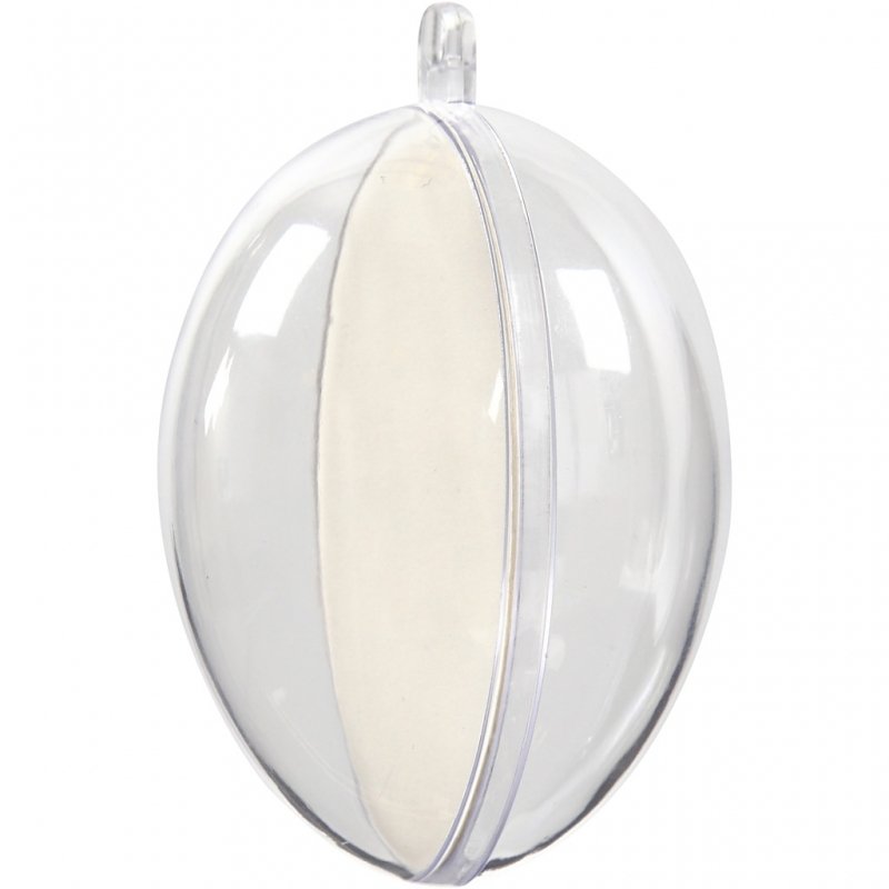 Todelt ophæng af klar, glat plast i form af et æg til at skille, fylde med pynt og samle. Løst kartonindlæg medfølger til at dekorere og indsætte Pk. med 10 stk. store æg og 15 stk. små æg