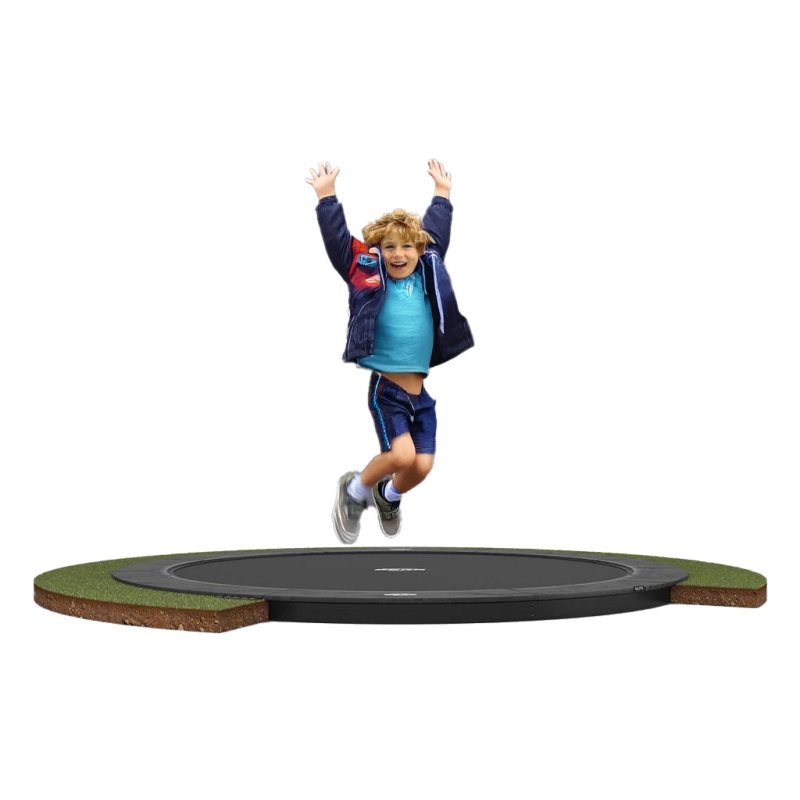Trampolinens robuste frame er helt nedsænket i jorden. Det eneste, som du kan se, er beskyttelseskanten og springmåtten. Du kan lave meget behagelige spring på denne trampolin. Godkendt efter EN1176 til institutioner og skoler