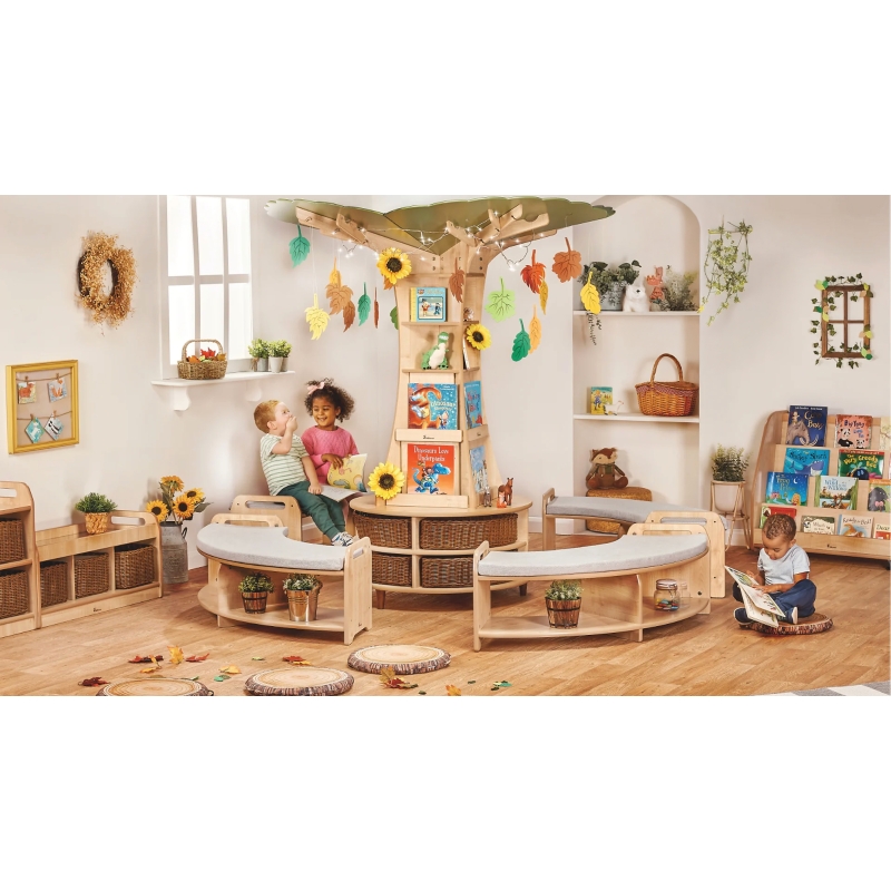 Stammen har 12 hjørnehylder og 8 boghylder i børnehøjde. 4 bænke med polstring.