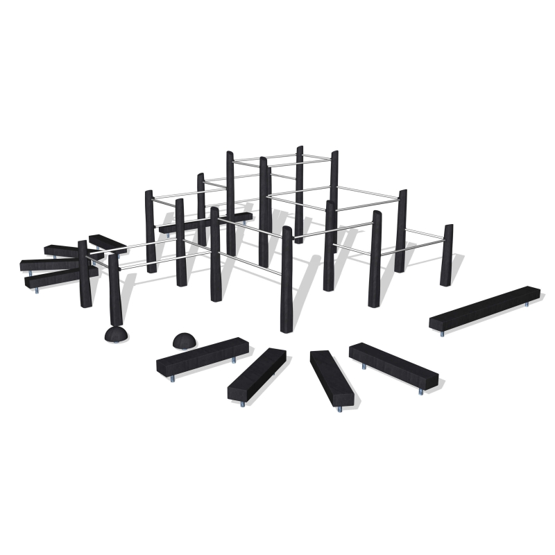 Robinia Agility bane” giver børn mulighed for at udforske balance, koordination og kropsforståelse i en sjov og aktiv ramme — med maksimum faldhøjde kun 99 cm, som gør den ideel til direkte placering på græs.