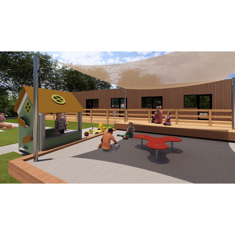 Sansestimulerende sandkassemiljø, hvor leg og læring smelter sammen i trygge omgivelser nær huset og i inspirerende rammer. Kanten af sandkassen er opbygget i egesveller, som både indrammer og indbyder til balancerende motorikleg. Ca. 4 x 4 meter. sandkasse