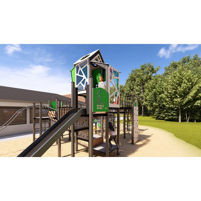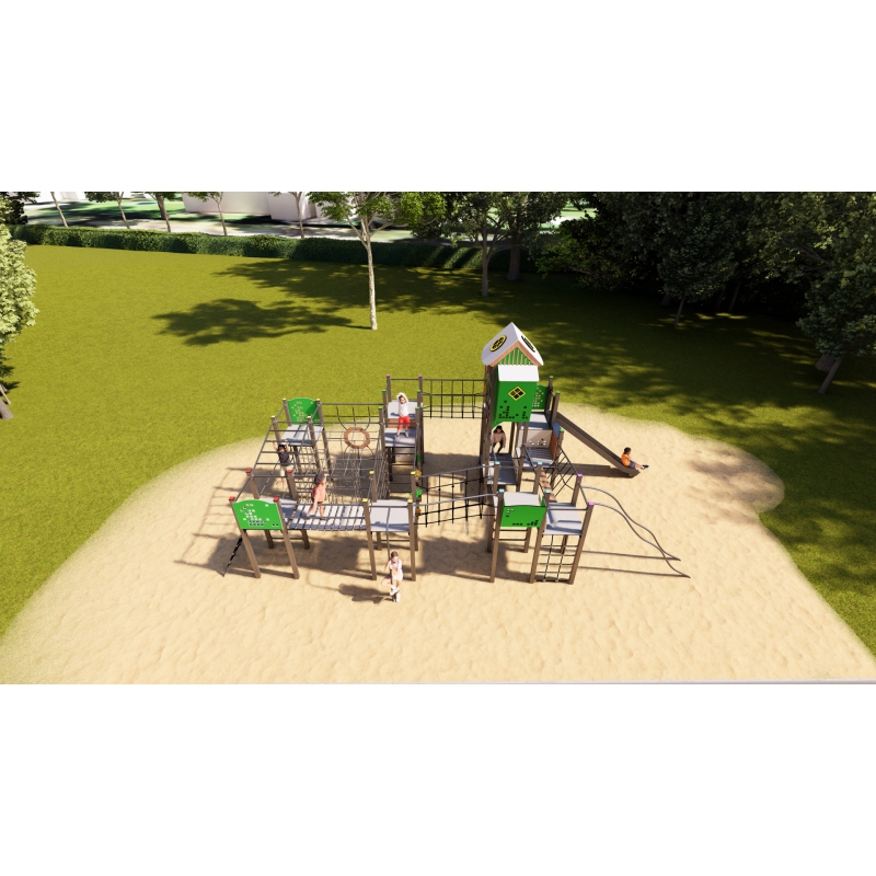 Lege- og Motoriktårn Bispevang er et stort og sammenhængende legeunivers, der forener idræt, motorik og fællesskab. Systemet giver børnene mulighed for at udfordre sig selv på mange niveauer – fra klassisk klatring og balance til rolleleg og socialt samvær.