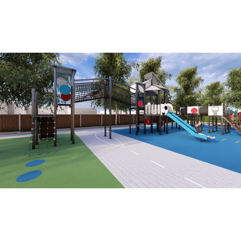 Med fokus på idræt og bevægelse bliver området et centralt samlingspunkt, hvor børnene kan afprøve deres grænser, finde rytmen i kroppen og opleve, at motorisk udvikling og leg hænger tæt sammen. Portalen gør det muligt at køretøjer kan køre igennem.