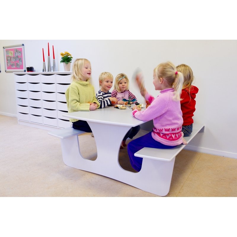 Klapbord i 18 mm. hvidpigmenteret birkekrydsfinder med lysegrå slidstærk laminat på bord og bænke.
