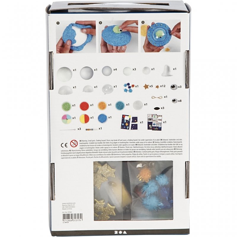Indhold: Pearl Clay®, Silk Clay® og metallic Foam Clay® i flere farver. Derudover styroporkugler, mosgummifigurer, øjne af plast, pomponer, nåle, ophæng samt ophængsnor og lim. Fortrykt baggund