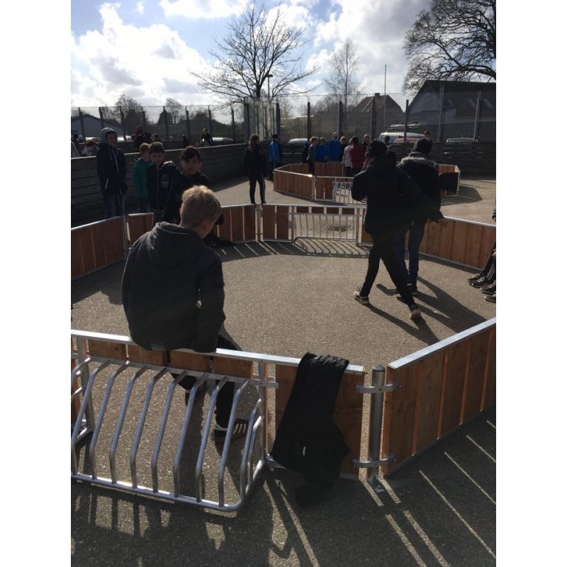 Træet er 45 mm tykt oliebehandlet spærtræ. Alle andre materialer er aluminium og rustfrit stål. Træet er beskyttet af aluminiumprofiler, og forstærket ved skruegennemgange, så det er et meget holdbart og korrosionsbestandigt koncept. Samtidig er banen meget støjsvag. 8-kant = 5,55 meter