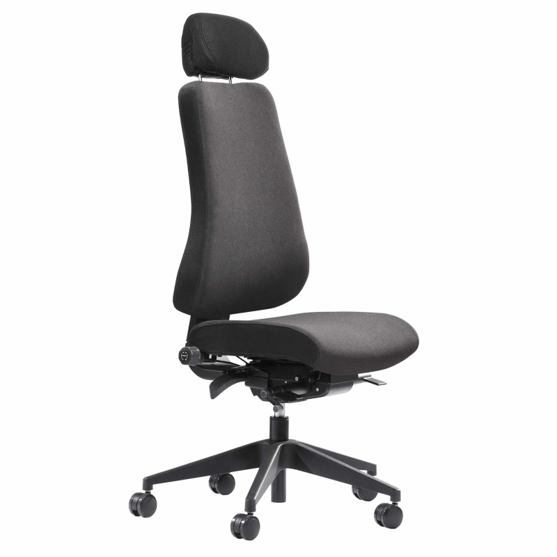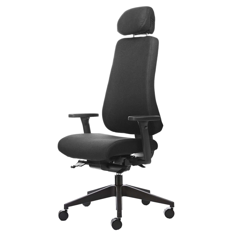 En kontorstol med ekstra god siddekomfort med alle ergonomiske indstillinger. Kontorstolen har høj ryg, højdejustering, synkron vippefunktion med vægtjustering, sædevip, lændestøtte, sædedybderegulering, justering af ryghøjden samt justerbar nakkestøtte. Siddehøjde på 48-59 cm. Kontorstolen leveres i sort og har bløde hjul. Der kan tilkøbes et multifunktionelt armlænssæt, som kan justeres i højde, dybde og vinkel for optimal komfort.