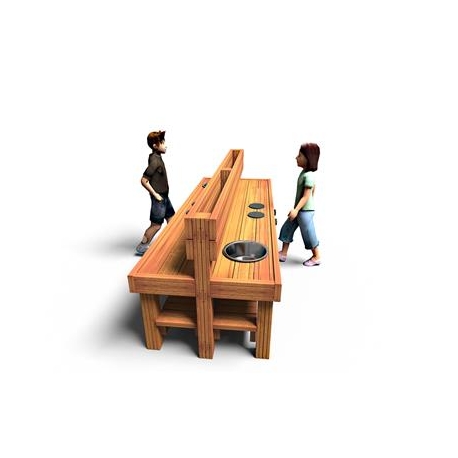 Dette udekøkken er et fantastisk til vuggestuer, børnhaver og skoler, da det tillader børnene at udleve deres køkkendrømme allerede i en ung alder. Udekøkkenet er bygget af træ i høj kvalitet, der sikrer køkkenets holdbarhed. Køkkenet indeholder en "håndvask" og to "kogeplader".